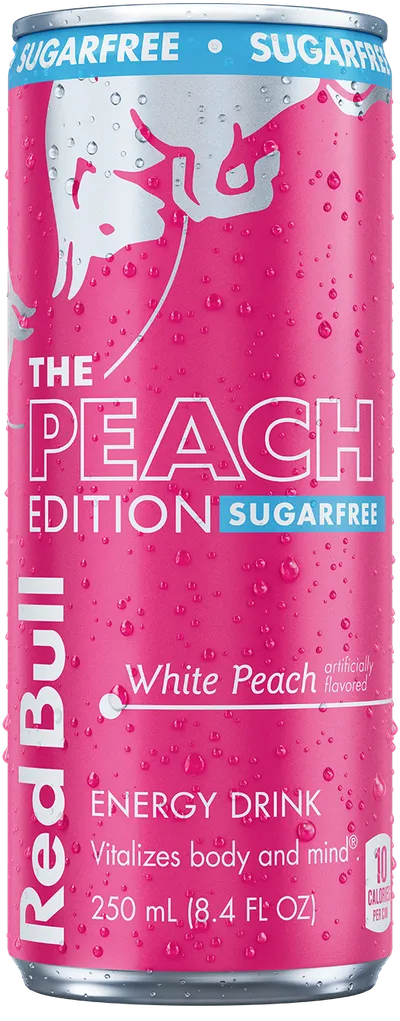 The Red Bull Peach Edition Sugarfree with the taste of white peach and a touch of citrus peel and floral notes*.